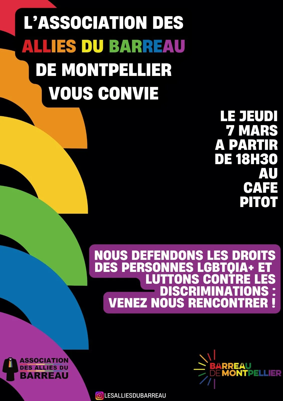 L’association des Alliés du Barreau est fière de vous convier à sa soirée de lancement, qui aura lieu au Café Pitot, 2 place d’Aviler à Montpellier